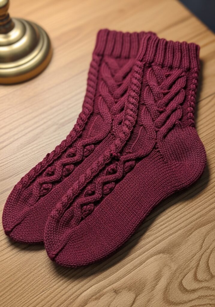 I think cable knit socks are such an underrated project and honestly one of my favorite things to knit when I want something that feels really rewarding. The combination of different cable panels running side by side keeps things interesting the whole way through, so you never hit that boring middle stretch that gets a lot of knitters into trouble. If you already know the basics of sock knitting and want to level up with some serious texture, this design is calling your name. The deep red color also makes these an incredible gift idea for the holidays, and I promise whoever receives them will think you spent a fortune on them.