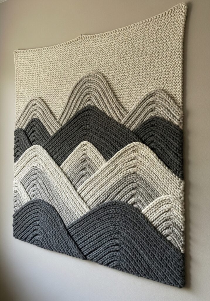 This wall hanging is so breathtaking that I genuinely had to sit with it for a moment before I could even find words, because it is less of a knitting project and more of a full blown landscape painting made entirely out of yarn. It’s worked in chunky weight yarn across a beautiful grey ombre palette that moves from a clean warm cream at the top through progressively deeper shades of light grey, mid grey and charcoal at the bottom, creating the most stunning atmospheric effect of distance and depth that genuinely mimics the way real mountain ranges look when you see them layered against a misty sky. Each mountain peak is built up with thick raised ridges of garter stitch that sit proud of the surface in overlapping dimensional layers, so the whole piece has this incredible sculptural topography that casts actual shadows across itself depending on the light. The piece is mounted on what appears to be a canvas or board frame that gives it clean straight edges and makes it look just like a framed piece of contemporary art hanging on the wall, which is exactly what it is.