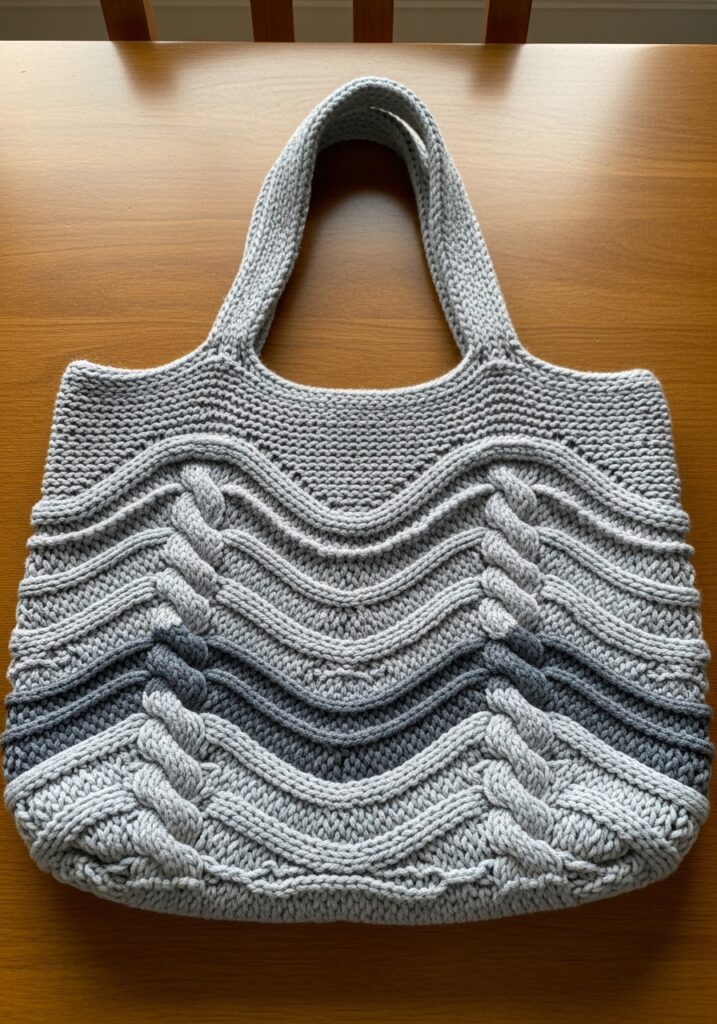 This tote bag is honestly one of the most architectural and eye-catching knitted bags I have ever seen. It’s worked in a soft silver grey cotton or cotton blend yarn that gives it a clean, modern look while still feeling cozy and handmade. The main body features the most incredible wave cable design, with thick raised cables sweeping gently from side to side across the bag in horizontal rows, each one pinched together at the left edge with a gathered or knotted detail that adds such a sculptural touch. The top section is worked in a simple seed or moss stitch that lets the eye settle before hitting all that gorgeous wave texture below. The chunky integrated handles are knitted in a matching rib and feel sturdy enough to actually carry your stuff around, which is always a win.
