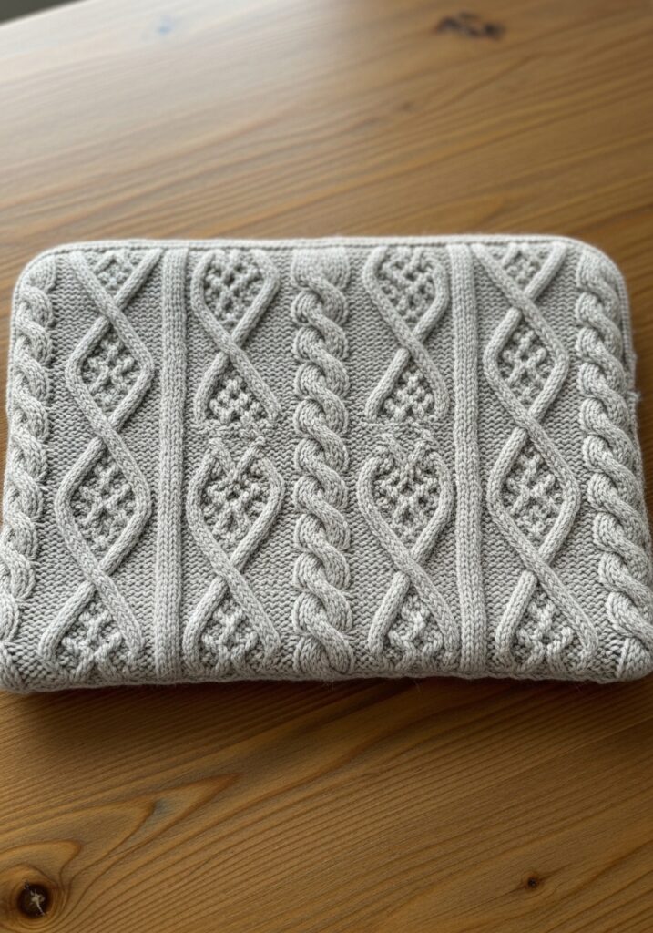 This laptop sleeve is giving full cozy Irish cottage vibes and I am completely here for it. It’s knitted in a warm oatmeal or light greige yarn that feels so neutral and sophisticated, the kind of color that goes with absolutely everything in your bag. The surface is packed with a stunning mix of traditional Aran cable panels running vertically across the whole piece, featuring thick braided cables, crossing rope cables, and those beautiful honeycomb or seed stitch diamonds nestled in between. Every single panel is different, which gives the whole thing this incredibly rich, layered look that feels almost like a textile art piece. It’s structured enough to actually protect your laptop while still being soft and cushioned, which honestly makes it one of the most practical knitting projects out there.