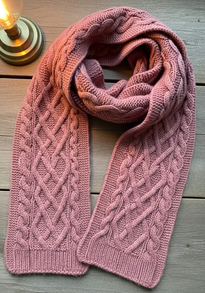 This scarf is the kind of thing you drape around your neck once and suddenly feel like you have your whole life together. It’s knitted in a gorgeous blush pink yarn that has the most beautiful warm, rosy tone to it, somewhere between a classic dusty rose and a soft terracotta that photographs absolutely dreamily in golden hour light. The design features wide, chunky braided cable panels running the full length of the scarf, framed on each side by a neat moss or seed stitch border that keeps the edges flat and tidy. The ends are finished with a clean ribbed cuff that gives the whole piece a really polished, intentional look. It’s generously wide and long too, so this is a proper scarf that actually keeps you warm rather than just sitting prettily around your collar doing nothing.