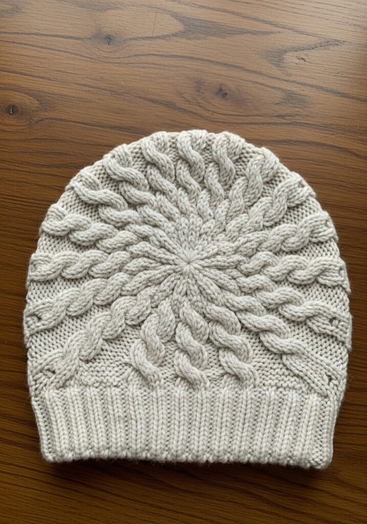 This beanie is one of those hats that looks so elegant and thoughtfully designed that people will genuinely assume you paid a lot of money for it somewhere very chic, and you will get to smile quietly and say nothing. It’s knitted in a beautiful soft oatmeal yarn that has a warm, creamy quality to it that feels luxurious against the skin, and the fabric looks like it could easily be a wool or alpaca blend given how beautifully the stitches are defined. The real magic of this hat is the spiral cable design that radiates outward from a central point at the crown, with thick rope cables fanning out in a pinwheel formation all the way down to the ribbed brim in the most hypnotic and satisfying pattern you have ever seen on a hat. Viewed from above it looks almost like a blooming flower or a geometric sunburst, and the way the cables twist and curve as they travel down the sides of the hat gives the whole thing incredible movement and dimension. The neat double ribbed brim grounds everything perfectly and makes the hat sit beautifully on the head.