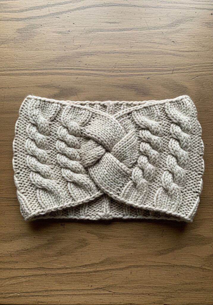This headband is one of those pieces that looks so effortlessly chic you would never guess it came off a pair of knitting needles rather than a designer accessory shelf. It’s worked in a lovely natural oatmeal yarn with a subtle heathered texture that gives it such a warm, earthy feel, the kind of neutral that works with literally every outfit you own. The real showstopper is that gorgeous central twisted knot detail where two chunky cable panels cross dramatically over each other right in the middle of the band, fanning out diagonally to each side like a big beautiful bow made entirely of braided stitches. The rest of the band is filled with neat rope cables that flow outward from the center twist, giving the whole design a really cohesive and intentional look. It sits wide and flat against the head which means it actually stays put and keeps your ears warm at the same time.