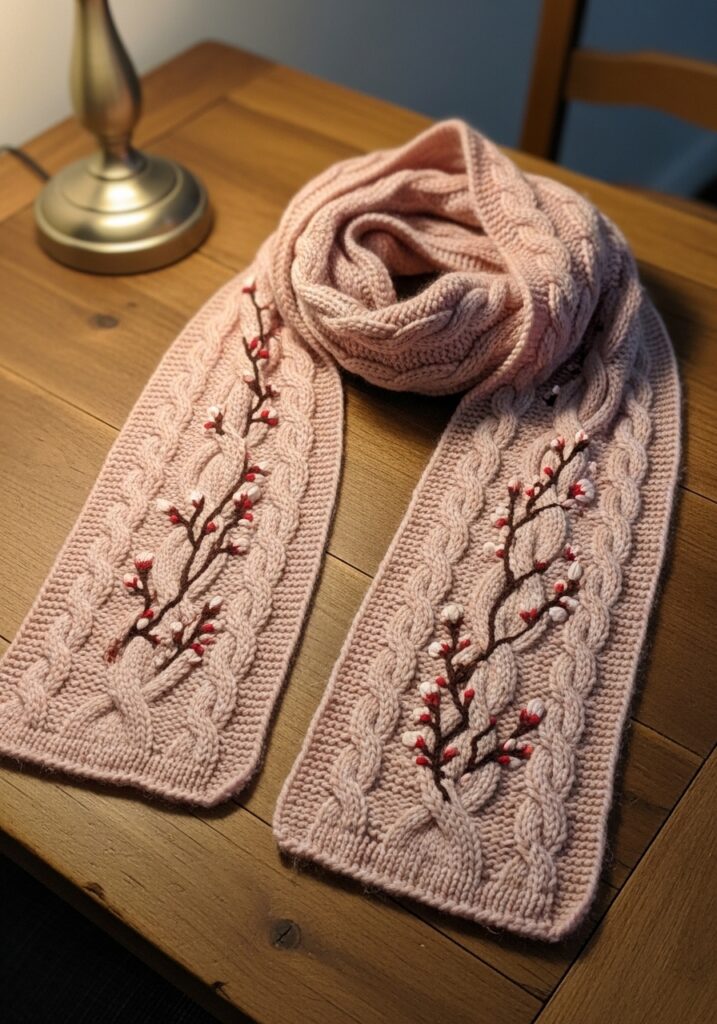 This scarf might just be the most romantic knitting project I have ever laid eyes on, and I say that with complete sincerity. It’s knitted in the softest powder pink yarn that has a really delicate, almost hazy quality to it, like something out of a dreamy springtime watercolor painting. The body features wide braided cable panels running along both sides of the scarf with a smooth stockinette center that acts as the perfect canvas for the most stunning hand embroidered blossom branches scattered across each end. The embroidery is done in deep brown, red, and creamy white, depicting delicate budding branches that look just like cherry blossoms about to burst into bloom. The combination of the raised cable texture and the flat embroidery on top creates this incredible layered effect that makes the whole scarf feel like genuine wearable art.
