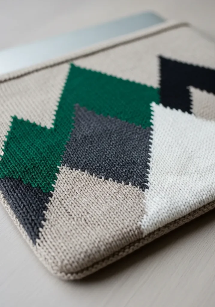 This knitted laptop sleeve has such a clean and contemporary feel. It is worked in smooth stockinette stitch with crisp color blocking in shades of deep green, charcoal gray, cream, and soft beige. The angular mountain like shapes create a bold geometric pattern that feels graphic yet cozy at the same time. A simple garter stitch border frames the piece and adds structure, helping it hold its shape. The fabric looks dense and protective while still soft enough to slide easily into a bag.