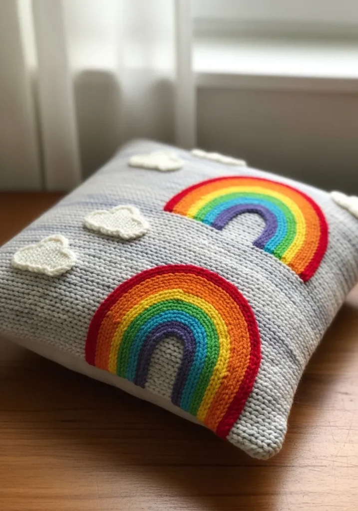 This knitted cushion cover instantly brightens up a room. The base is worked in a soft light gray yarn with a cozy textured stitch that gives it a plush feel. Across the front, bold rainbow arches in vibrant red, orange, yellow, green, blue, and purple curve beautifully from side to side. Small white knitted clouds add a sweet finishing touch and create a playful layered look. The raised rainbow stripes give the design depth and make the colors really pop against the neutral background.
