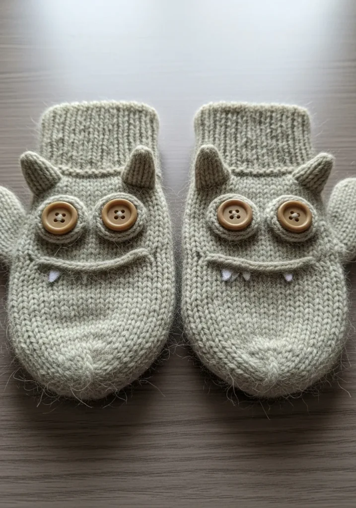 These knitted mittens are full of personality. Made in a soft light gray yarn with a cozy ribbed cuff, they feature smooth stockinette stitching across the hand for a comfy fit. The front of each mitten is transformed into a playful little monster face with raised button eyes, tiny knitted horns, and a curved stitched smile showing small felt fangs. The slightly fuzzy yarn gives them a warm and cuddly texture, while the three dimensional details make them stand out in the cutest way.