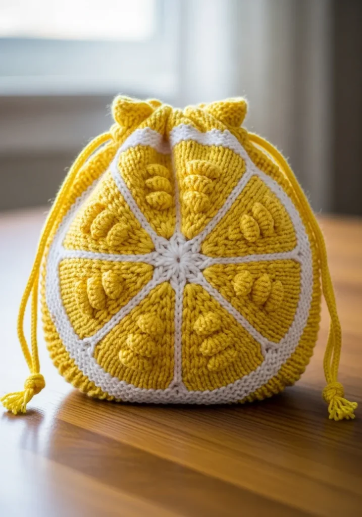 This knitted drawstring pouch is the cutest little burst of citrus. Worked in bright yellow and creamy white yarn, the front is designed to look like a juicy lemon slice with neat wedge sections radiating from the center. Each segment has raised bobble stitches that mimic the texture of fruit pulp, giving the surface playful dimension. The white border frames the lemon shape beautifully, and the matching yellow drawstrings with tiny tassel ends add a sweet finishing touch. The stitches look soft yet sturdy, making it perfect for holding small treasures.
