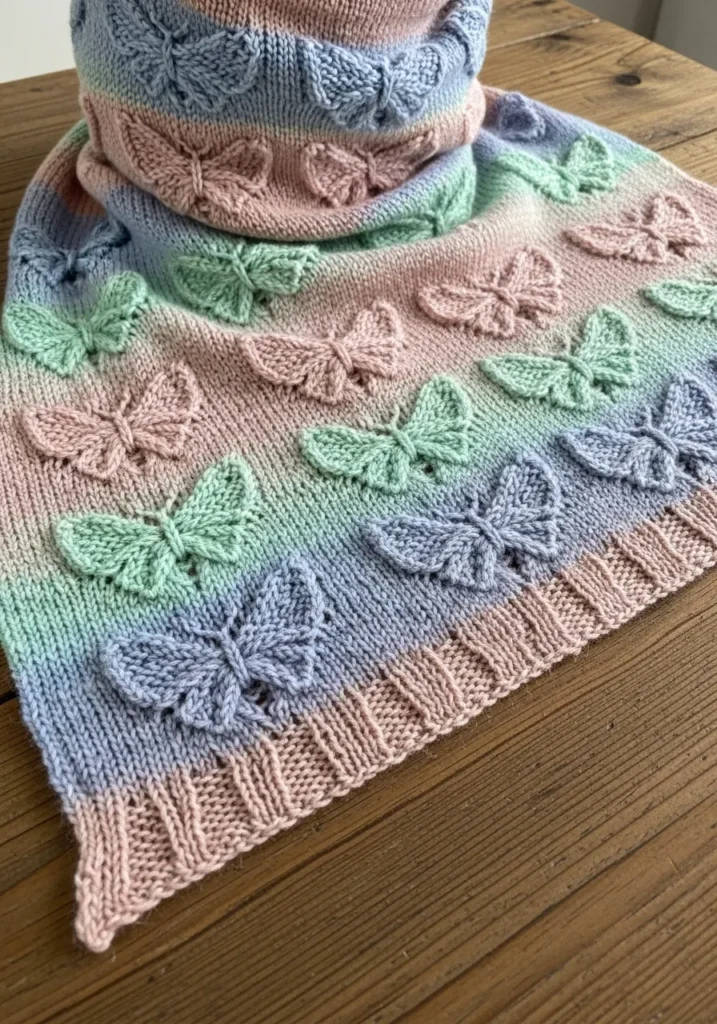 This knitted scarf feels like a soft spring day wrapped around your neck. It is worked in gentle pastel stripes of blush pink, powder blue, and mint green that blend beautifully from one shade to the next. Across the surface, raised butterfly motifs add a delicate three dimensional touch, with each pair of wings carefully shaped in matching or contrasting tones. The ribbed edge gives it a neat finish and a bit of stretch, while the smooth stockinette background lets the butterflies truly stand out. The texture looks cozy yet lightweight, perfect for layering.