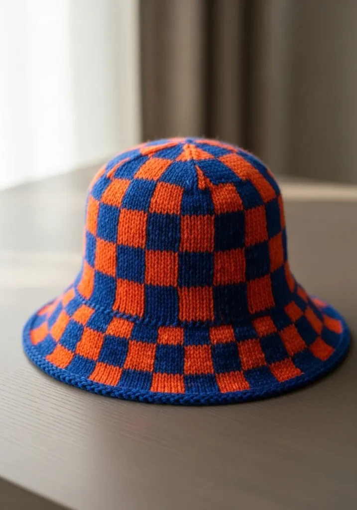 This knitted bucket hat is all about statement style. It features a classic checkerboard pattern in rich navy blue and bright orange, creating a bold contrast that instantly catches the eye. The stitches are smooth and even, giving the hat a clean structured look, while the gently flared brim adds that relaxed bucket shape we all love. The crown is neatly shaped at the top, and the colorwork squares line up beautifully from top to brim for a polished finish.