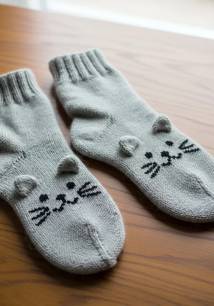 These knitted socks are the perfect mix of cozy and adorable. Made in a soft light gray yarn, they feature classic ribbed cuffs and smooth stockinette stitch through the foot for a comfy everyday fit. The real charm is in the sweet cat faces stitched onto the top, complete with tiny black eyes, whiskers, and little pinkish noses. Small three dimensional ears are knit and attached near the ankle, giving each sock extra personality. The texture looks soft and slightly fuzzy, adding that warm handmade feel we all love.