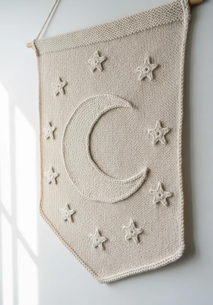 I love projects like this because they turn knitting into wall art. It feels creative without being complicated, and the neutral color makes it easy to match with almost any decor style. If you enjoy adding a bit of personality to your home, this moon and stars design is such a sweet way to do it. It is soothing to knit and even more satisfying to see hanging proudly on the wall.