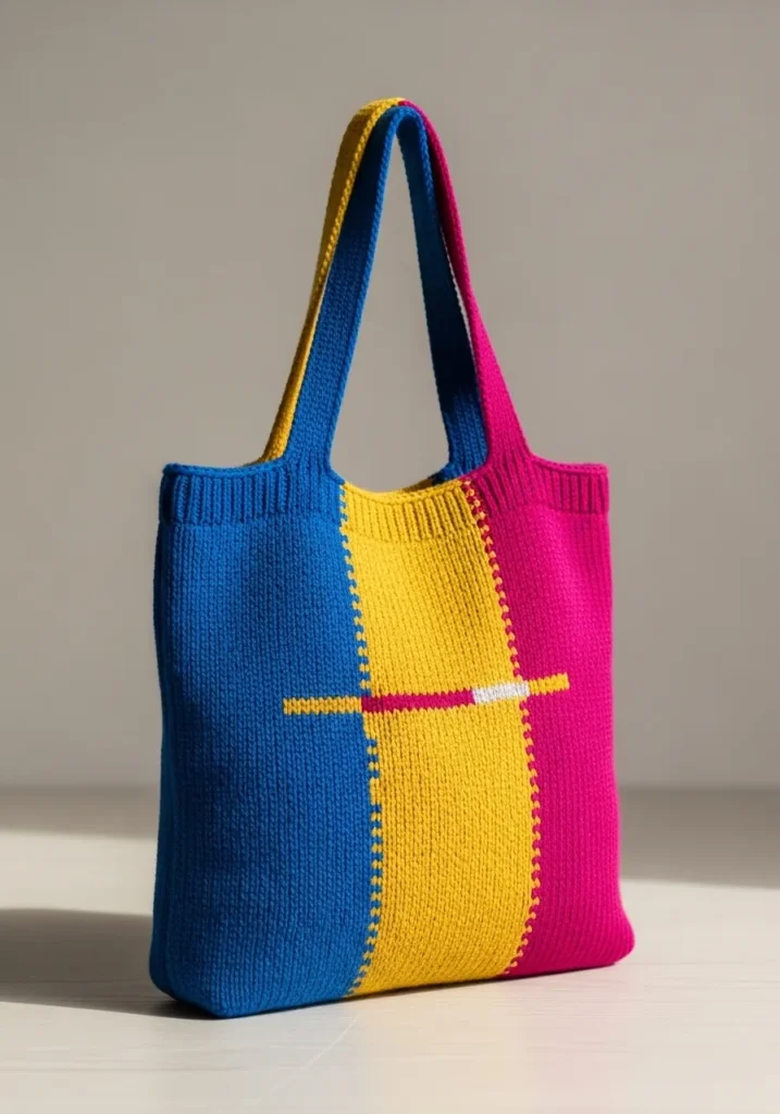 This knitted tote bag features bold vertical color blocking in electric blue, sunshine yellow, and hot pink, creating a striking modern look. The clean lines between each color section make the design feel graphic and confident, while the sturdy knit texture gives it structure and everyday practicality.