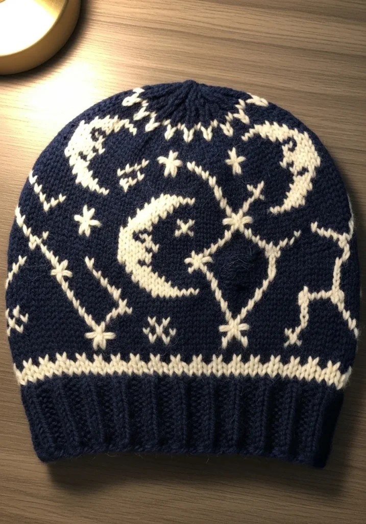 This knitted beanie pairs a deep navy base with crisp white celestial motifs scattered across the surface. The classic Fair Isle pattern adds intricate detail, and the high contrast between dark and light yarn makes every star and swirl stand out beautifully.