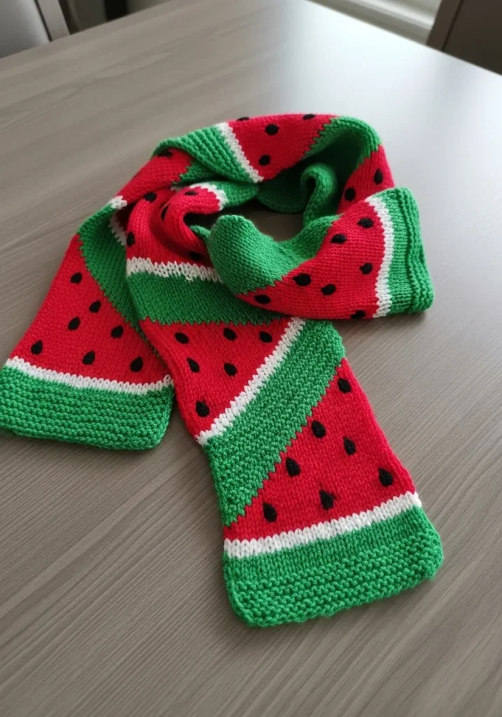This knitted scarf combines juicy red, bright green, and tiny black seed like accents to create a playful watermelon inspired design. The smooth stitches and cheerful color placement make the piece feel lively and fun, while the soft yarn keeps it wearable and cozy.
