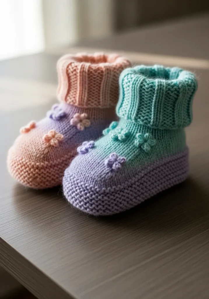 These knitted baby booties are worked in soft pastel shades of blush pink, mint green, and lavender, each pair featuring ribbed cuffs and tiny textured details that add extra charm. The smooth stockinette stitches keep the surface neat and cozy, while the contrasting color blocks give each little shoe its own sweet personality. The gentle yarn fuzz and plush structure make them look irresistibly soft and perfect for tiny toes.