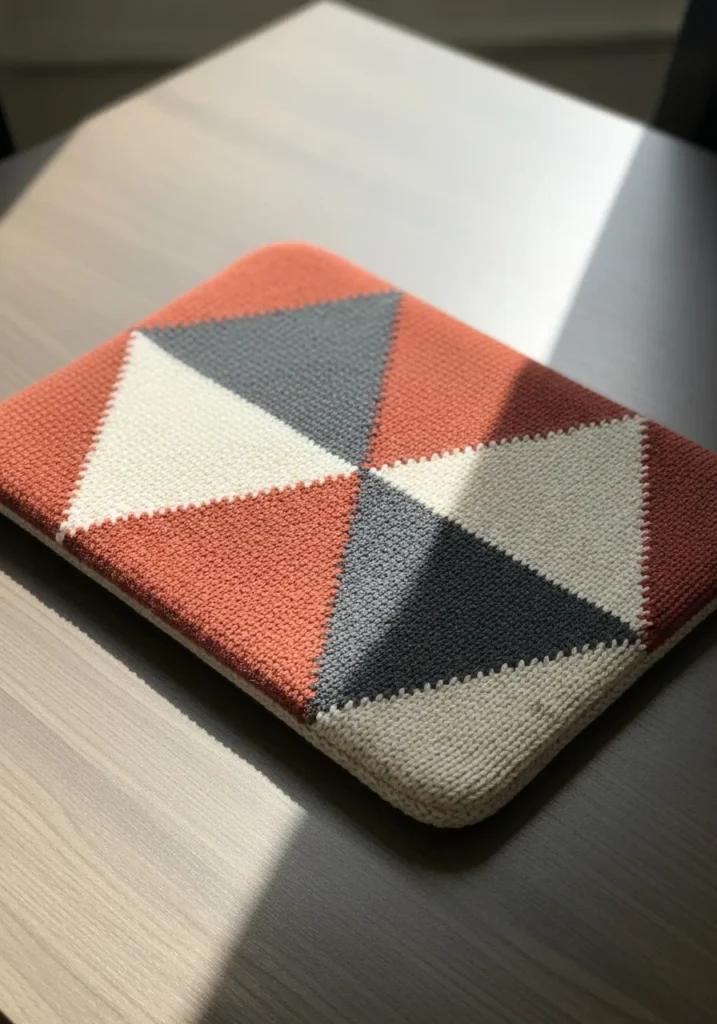 This knitted laptop sleeve features bold triangle colorwork in rich terracotta, soft cream, and deep charcoal yarn arranged in a striking geometric layout. The clean lines of the triangles meet sharply at the center, creating a modern pinwheel effect that instantly catches the eye. The smooth stockinette stitches highlight the contrast between the warm and cool tones, while the snug rectangular shape makes it both stylish and functional for everyday use.