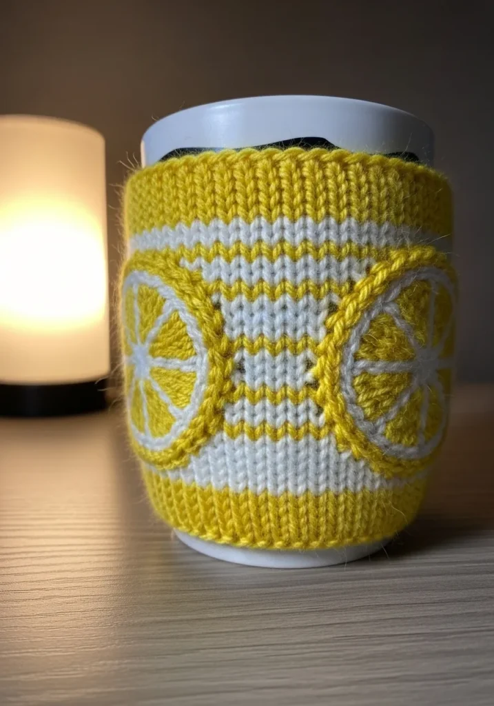 This cheerful knitted mug cozy is worked in bright lemon yellow with white stripes and playful citrus slice motifs stitched right into the fabric. The textured details of the fruit segments add depth, while the snug cylindrical shape wraps neatly around a cup. The vibrant yellow yarn instantly draws the eye and feels warm and energizing.