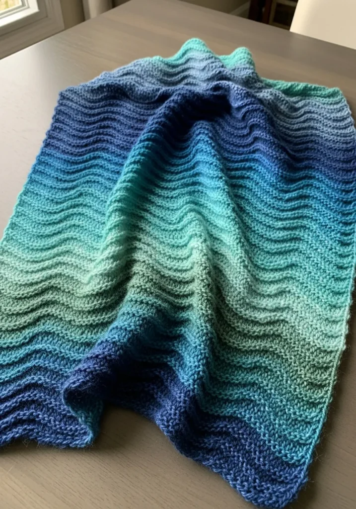 This knitted blanket flows beautifully from deep navy to teal and soft aqua, creating a smooth ombre effect that feels like gentle ocean waves. The consistent stitch pattern lets the color gradient take center stage, while the cozy thickness gives it a comforting drape. The blend of cool tones adds depth and movement without overwhelming the design.