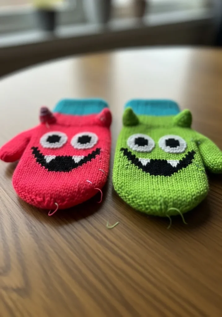 These knitted monster mittens are bursting with personality in bold hot pink and electric lime green yarn, each topped with tiny knit horns and finished with oversized cartoon eyes and cheeky black grins. The bright turquoise cuffs add an extra pop of contrast, making the colors feel even more playful and energetic. The smooth stockinette stitches keep the base clean and vibrant, while the stitched facial details give each mitten its own mischievous charm.