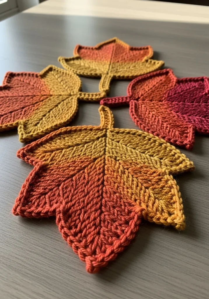 These knitted leaf shaped coasters are crafted in warm shades of burnt orange, mustard, and deep red, with textured vein details that bring each leaf to life. The pointed edges and layered color tones mimic real fall foliage, while the sturdy knit fabric keeps them practical for everyday use. The rich, earthy palette feels cozy and seasonal.