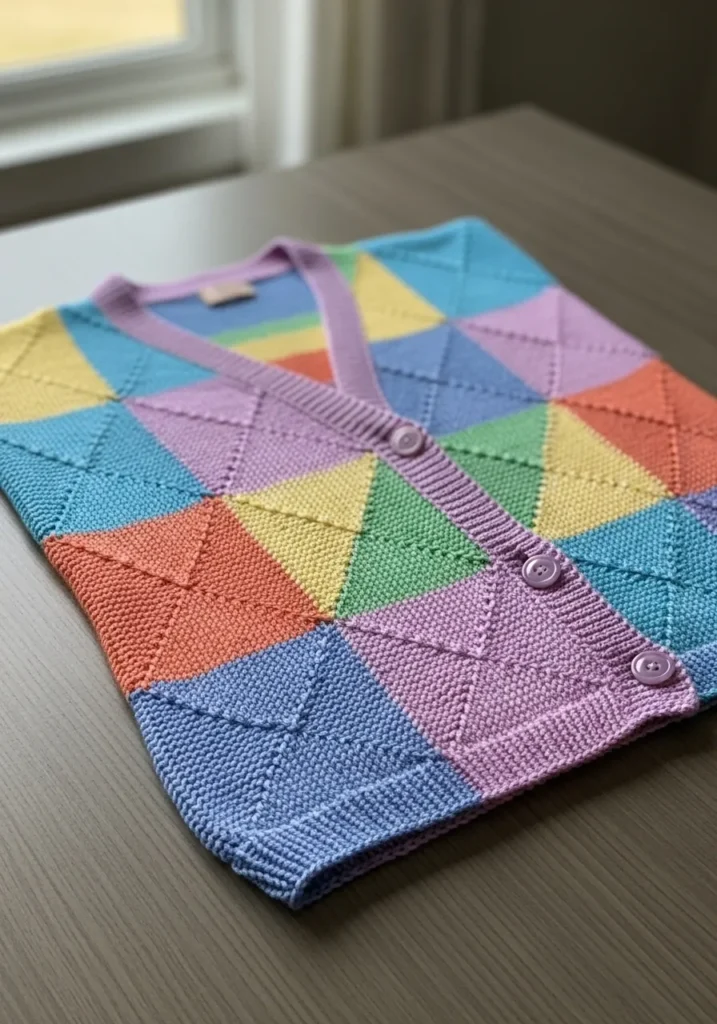 This knitted cardigan features a playful patchwork of soft pastel triangles in lavender, baby blue, mint green, buttery yellow, and warm peach, all framed by a lilac button band and matching ribbed hem. The neat geometric layout gives it a quilt inspired feel, while the smooth knit texture keeps the colors looking crisp and fresh. Each triangle pops gently against the next, creating a lighthearted mix that feels cheerful without being overwhelming.