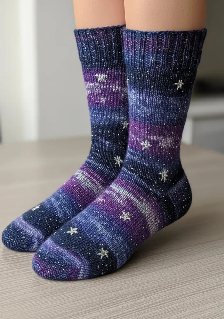 These cozy knitted socks feature a dreamy mix of deep purple, indigo, and midnight blue yarn with tiny white speckles scattered throughout like stars across a night sky. The smooth stockinette texture lets the variegated colors shine, while the ribbed cuffs add structure and a snug fit. The subtle shifts in tone create a galaxy inspired look that feels playful yet slightly mysterious, perfect for anyone who loves rich, moody shades with personality.