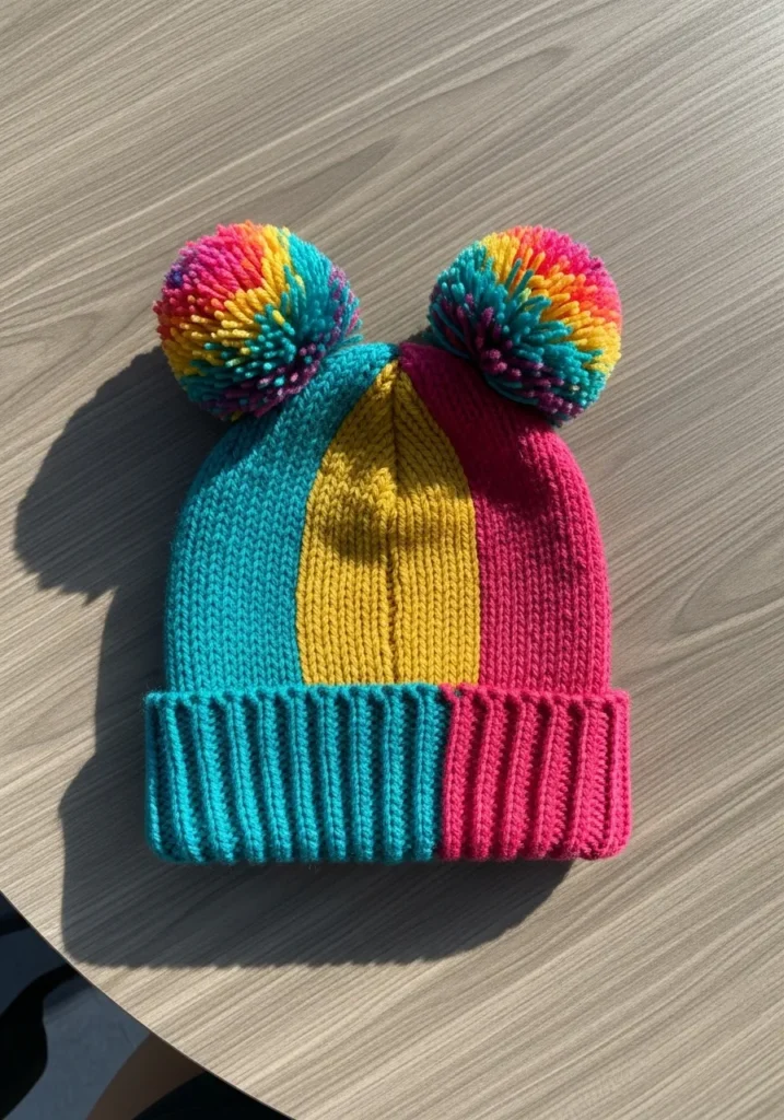 Some people love neutrals, but I cannot resist a hat that makes everyone smile. Mixing bright yarn shades like this feels fearless and creative, yet the pattern itself stays simple and beginner friendly. I find that color blocking is one of the easiest ways to play with personality in knitting, and adding pom poms just makes it even more joyful.
