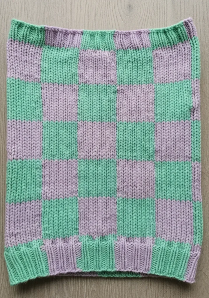 This knitted sweater panel showcases bold retro checkerboard colorwork in soft lavender and fresh mint green, creating a playful yet balanced contrast that instantly catches the eye. The smooth stockinette squares highlight subtle yarn texture shifts and faint stitch imperfections that give it that authentic handmade charm, and the ribbed edging frames the panel beautifully while keeping the overall look neat and structured against the neutral wooden background.
