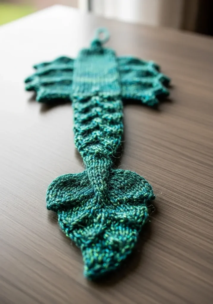 This knitted bookmark is shaped like a whimsical dragon tail, worked in shimmering teal and deep emerald tones that shift beautifully in soft natural light. The scale like stitch details add texture and movement along the length, while subtle yarn fuzz and slight variations in the stitches give it that perfectly imperfect handmade feel against the neutral wooden table.