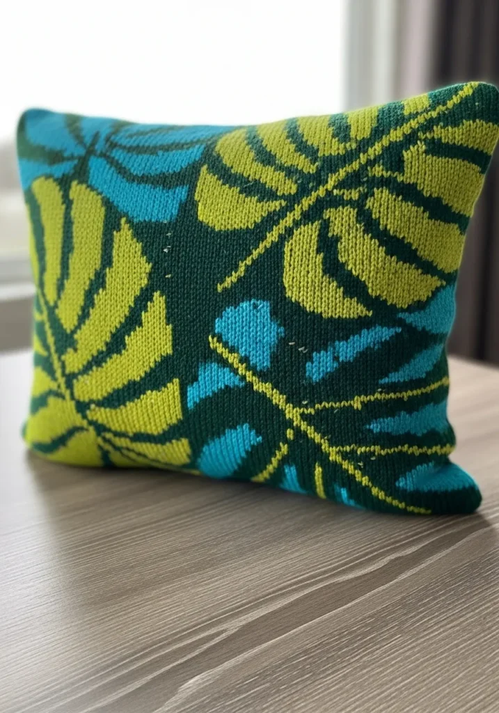 This knitted pillow cover bursts with personality through vibrant lime green and deep turquoise leaf motifs layered over a darker background. The bold botanical shapes are crisp and graphic, and the smooth knit surface makes the high contrast colors pop in a fresh, modern way.