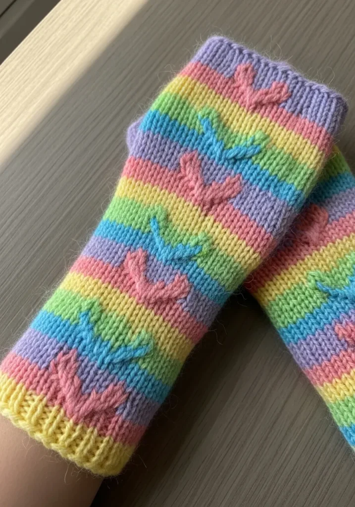 These knitted wrist warmers glow with soft pastel rainbow stripes in lavender, buttery yellow, mint green, baby blue, and blush pink, creating the sweetest candy colored palette. Tiny heart motifs in blush and baby blue are woven into the stripes, adding delicate texture and charm, while slight yarn fuzz and gentle natural shadows give the piece that cozy, real life handmade feel against the neutral wooden table.