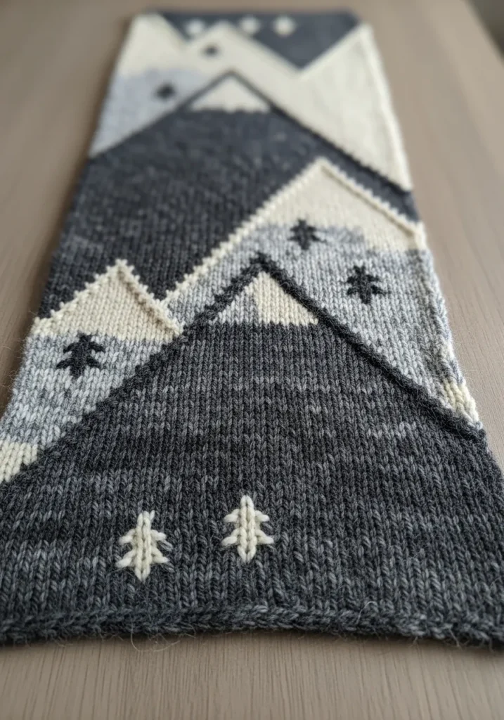This knitted pillow cover showcases a moody gray background with crisp white mountain peaks and tiny tree motifs near the base. The design feels modern and minimal, with clean geometric lines that contrast beautifully against the soft texture of the yarn. The color palette stays neutral, which makes the bold triangular shapes stand out even more. It has that cozy cabin vibe without feeling too busy.