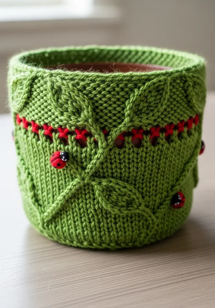 This vibrant green knitted plant cozy features raised leaf motifs that wrap around the surface in a textured pattern. Small red berry details add a pop of contrast, making the design feel lively and festive. The yarn appears soft yet structured enough to hold its cylindrical shape, creating a snug cover for a planter. The combination of texture and color makes it eye catching without being overwhelming.