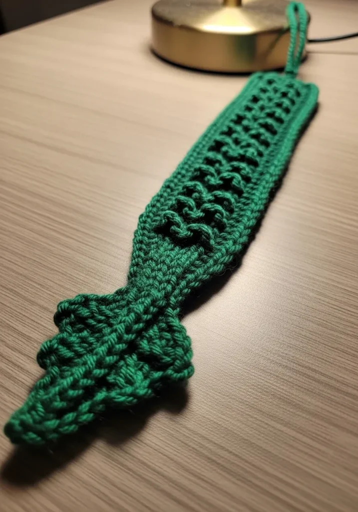 This deep green knitted bookmark features a bold cable running down the center, giving it a classic and slightly rustic feel. The yarn looks thick and plush, with the cable twists adding beautiful dimension. The elongated shape is practical for slipping between pages, and the sturdy texture suggests it will hold up well with regular use. It is simple but full of character.
