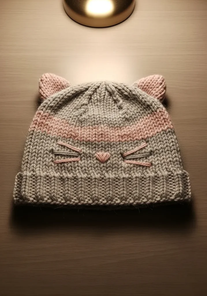 This adorable beanie is crafted in a soft beige yarn with a subtle heathered texture that gives it warmth and depth. The design features gentle shaping at the top to create tiny cat ears, along with embroidered whiskers and a little pink nose on the folded brim. The ribbed edge keeps it snug and practical, while the simple knit stitches make the playful details pop without overwhelming the look.