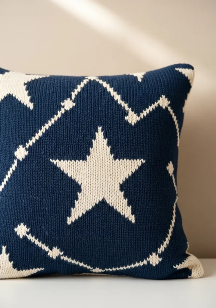 This eye catching cushion cover is knitted in deep navy and crisp white yarn, forming a large central star framed by a geometric border. The fabric looks dense and structured, which helps the pillow hold its shape beautifully. The contrast between the dark background and the bright star creates a modern, graphic vibe that would look stunning on a sofa or reading chair.