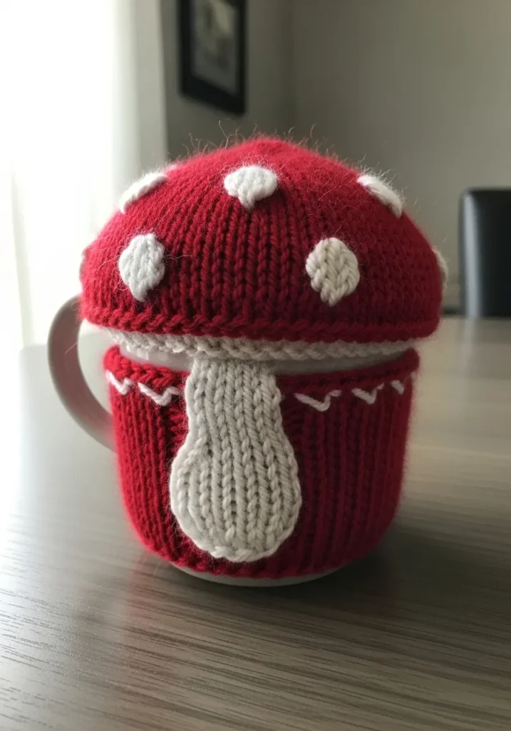 This charming mushroom shaped piece is knitted in vibrant red yarn with white spots and a creamy stem that doubles as a little container. The rounded cap has gentle shaping that gives it a plump, storybook look, while the textured stitches add dimension. The combination of bright color and soft structure makes it feel playful yet cozy.