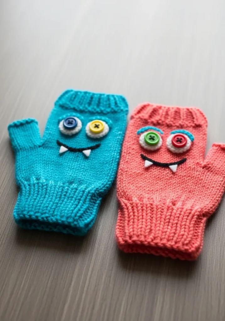 These playful fingerless gloves are knitted in bright turquoise and coral yarn with a soft, stretchy ribbed cuff and a smooth knit body. Each glove features oversized button eyes in fun contrasting colors and tiny stitched teeth that peek out in a cheeky grin. The texture looks cozy and slightly chunky, which makes the bold colors and goofy faces stand out even more.