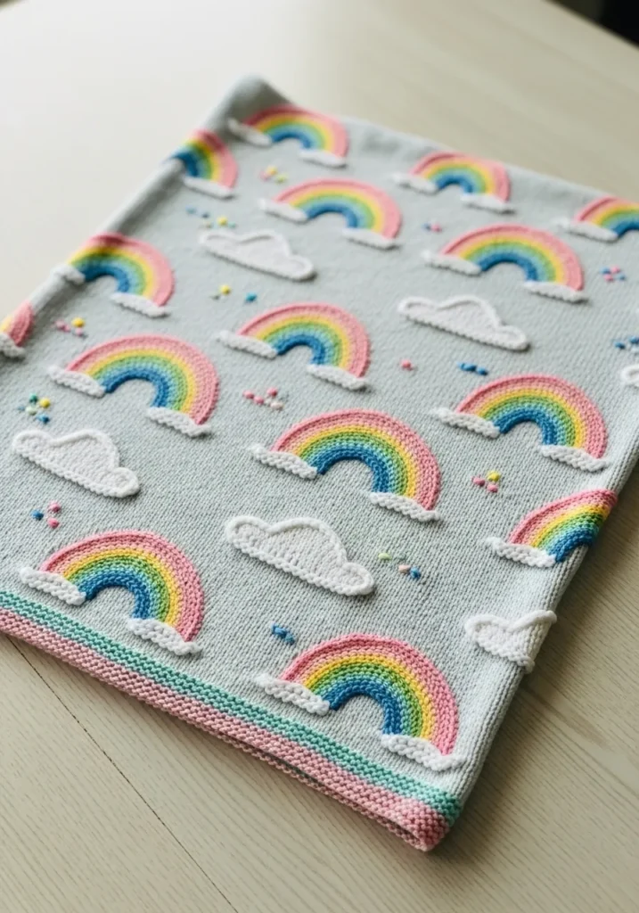 This sweet baby blanket is knitted on a soft grey base with repeating rainbow motifs in pastel shades of pink, yellow, green, and blue. Tiny white clouds float between the rainbows, giving the whole piece a dreamy and uplifting vibe. The texture looks smooth and gentle, which makes it perfect for delicate baby skin while still being visually playful.