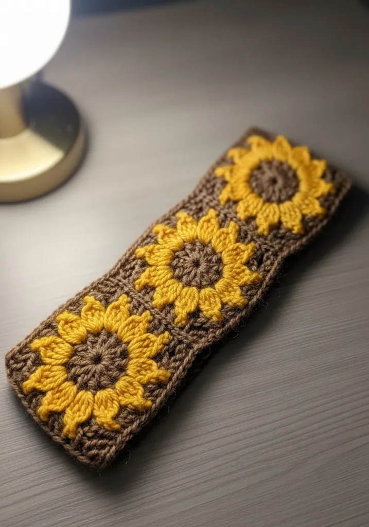 This eye catching headband features rich brown yarn as the base with bold sunflower motifs in golden yellow and deep amber tones. The flowers are arranged in a neat row, and the textured petals give the design depth and charm. The band looks wide and cozy, making it both stylish and practical for cooler days.