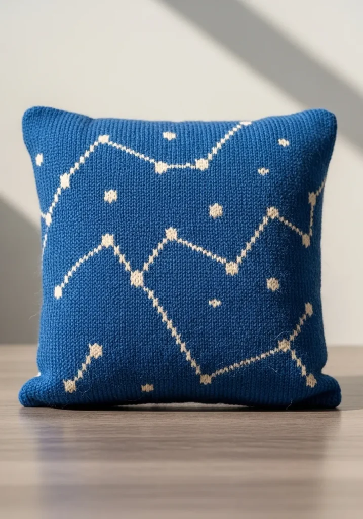 This knitted throw pillow features deep blue yarn with delicate white stitched lines forming constellations and tiny star dots across the surface. The square shape is clean and structured, and the knit fabric looks soft yet sturdy enough to hold its form. The contrast between the rich navy background and the crisp white pattern creates a calm, cozy vibe that feels perfect for a living room or bedroom accent.