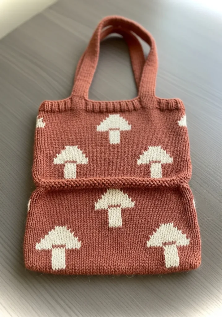 This soft pink knitted tote bag features repeating white mushroom motifs across the front flap and body, creating a sweet woodland inspired pattern. The yarn looks medium weight with a smooth finish, and the sturdy knitted handles are seamlessly attached for a clean look. The simple rectangular construction keeps the design approachable while still looking thoughtful and stylish.