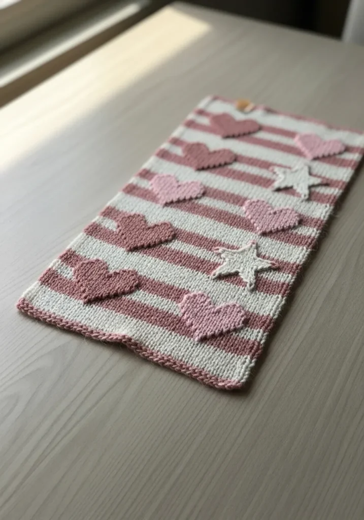 This rectangular knit dishcloth combines soft pink and creamy white stripes with raised heart shapes repeating across the surface. The texture stands out beautifully against the smooth background, giving it that sweet handmade charm. The edges are neatly finished, and the lightweight cotton yarn makes it practical for everyday kitchen use.