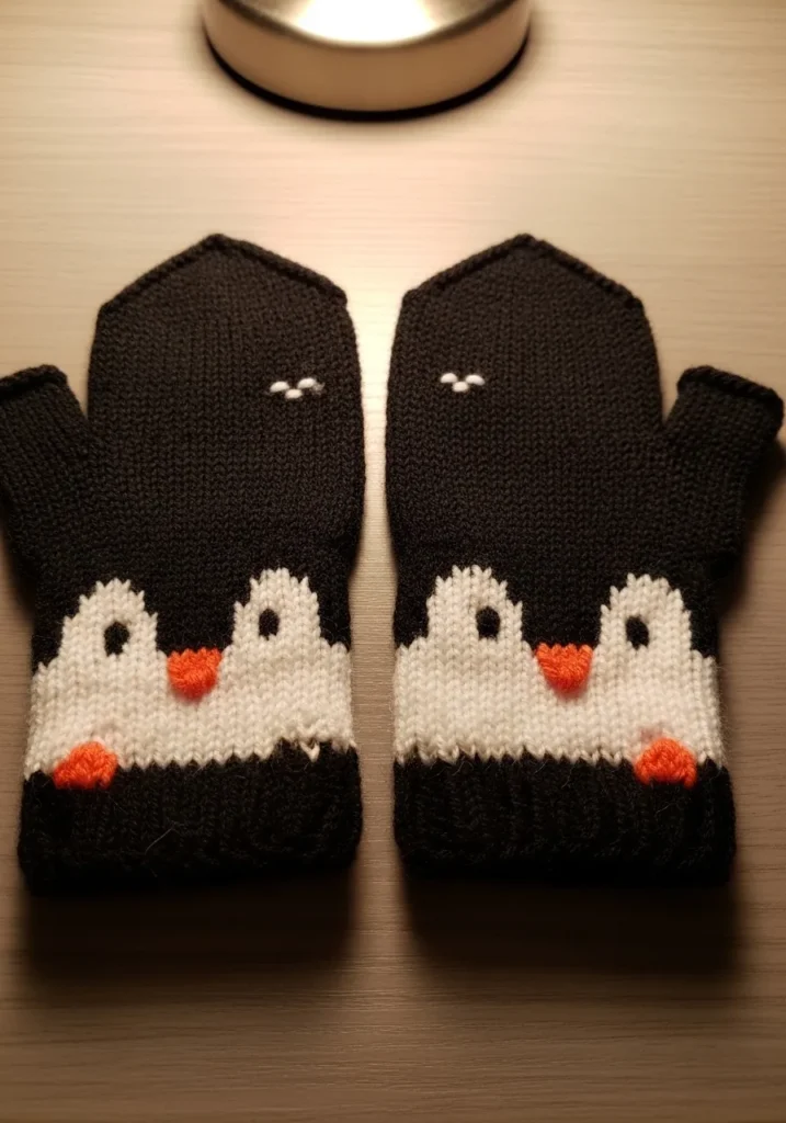 These black knitted mittens feature adorable penguin faces with white belly panels and tiny orange beaks stitched onto the front. The body is smooth and structured, while the color blocking adds bold contrast and personality. The ribbed cuffs look snug and cozy, making them perfect for chilly days.