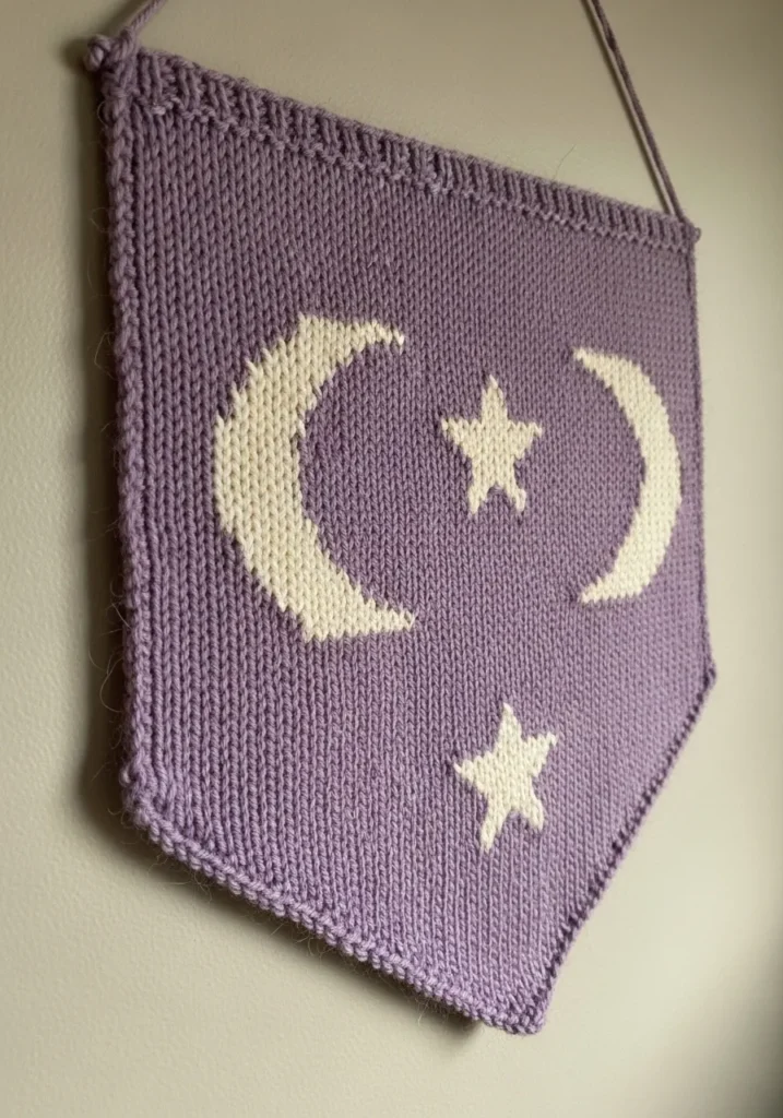 This knitted wall hanging features a soft lavender background with a clean white crescent moon and scattered stars stitched right into the fabric. The piece is shaped into a neat banner with a pointed bottom and hung from a slim wooden dowel, giving it a modern handmade vibe. The stitches look even and tidy, creating a smooth surface that really shows off the simple celestial design.