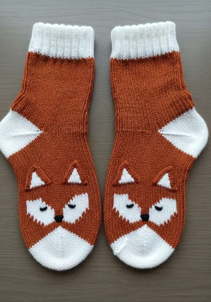 These adorable ankle socks are knitted in a warm burnt orange yarn with creamy white cuffs, heels, and toes that create a soft contrast. The front features a sweet little fox face worked in simple color blocking, with tiny triangular ears and closed eyes that give it a calm, sleepy expression. The ribbed cuff adds stretch and structure, while the smooth stockinette body keeps the texture clean and beginner friendly. The overall design feels playful yet polished, making them just as cute peeking out of sneakers as they are lounging around the house.