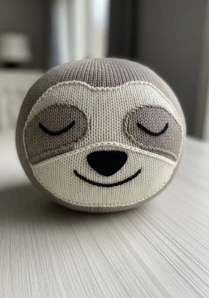 This round sloth plush is worked in warm gray and cream yarn with stitched closed eyes and a tiny curved smile. The face details are neatly embroidered, giving it a sweet and peaceful expression. Its smooth, rounded shape and tight stitches make it look polished while still soft and cuddly.