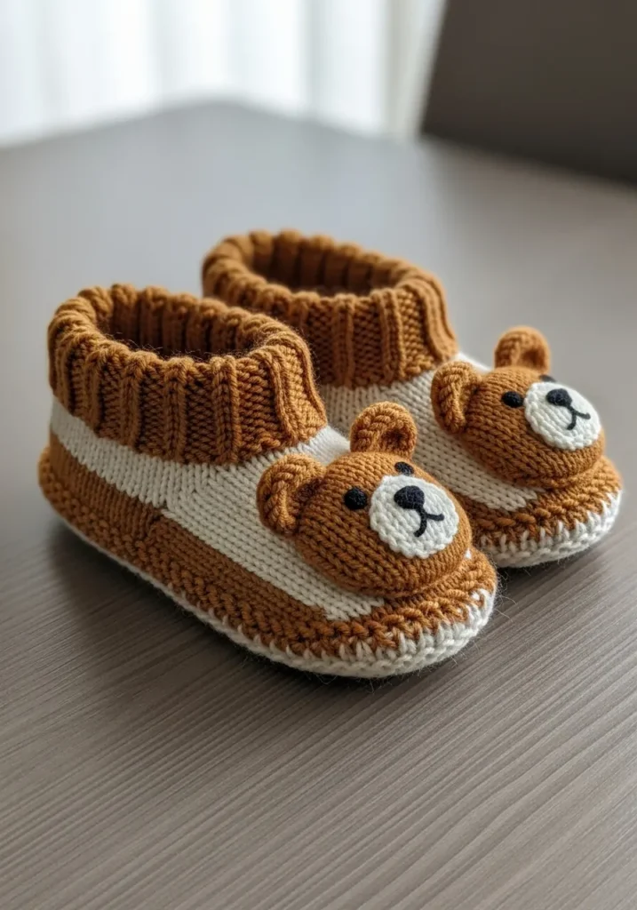 These knitted baby booties are made in a warm caramel brown with cream accents and tiny bear faces on the front. The ribbed cuffs add stretch and structure, while the textured soles look sturdy yet soft. The little ears and stitched features bring the design to life in such a charming way.