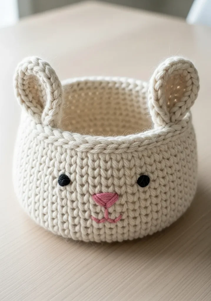 This sweet knitted basket is crafted in soft cream yarn with a sturdy, chunky texture that helps it hold its shape. The round base is firm and even, while the two upright bunny ears add height and personality. Simple stitched eyes and a pink nose give it an irresistibly cute finish.